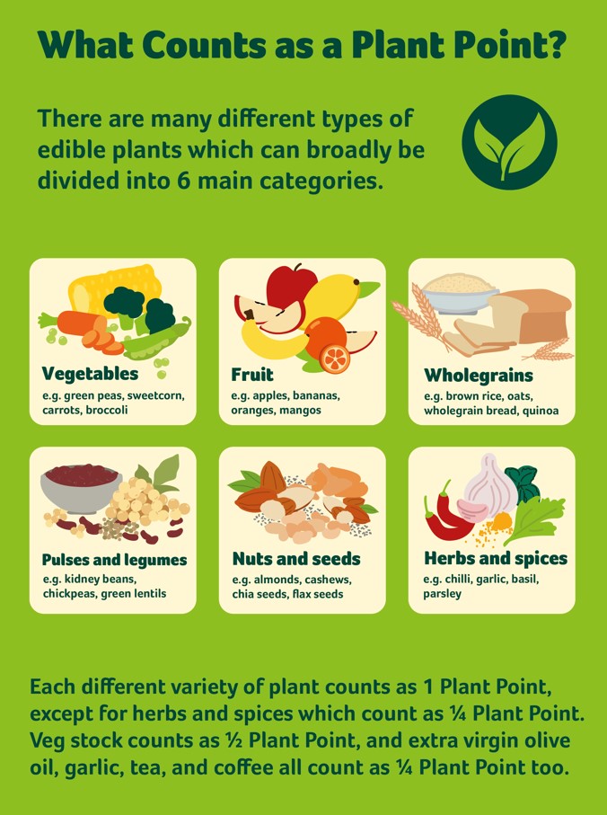 Even different coloured varieties of the same vegetable or fruit count as an additional Plant Point. For example, eating red and green peppers count as two different Plant Points, as these provide a slightly different mixture of nutrients and other goodies.